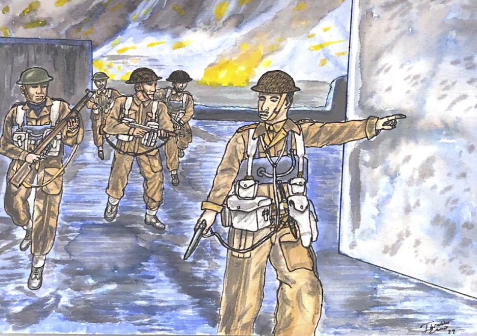 The above picture depicts Lieutenant-Colonel Charles Newman of No. 2 Commando leading the surviving troops, who have just laid and fired their explosive charges around the dry-dock. Establishing his HQ near the U-boat pens, Newman was one of the first of the Commando force to disembark. With their motor launches damaged and in flames, the Commandos decided to fight their way home instead of surrendering. A sudden charge across a heavily-defended lifting bridge meant the troops were on their way towards the St Nazaire town. But a combination of fatigue, wounds and low ammunition meant that the survivors were swiftly captured by dawn. Newman would survive the war and, along with four others, was awarded the Victoria Cross for his exceptional effort during the raid.