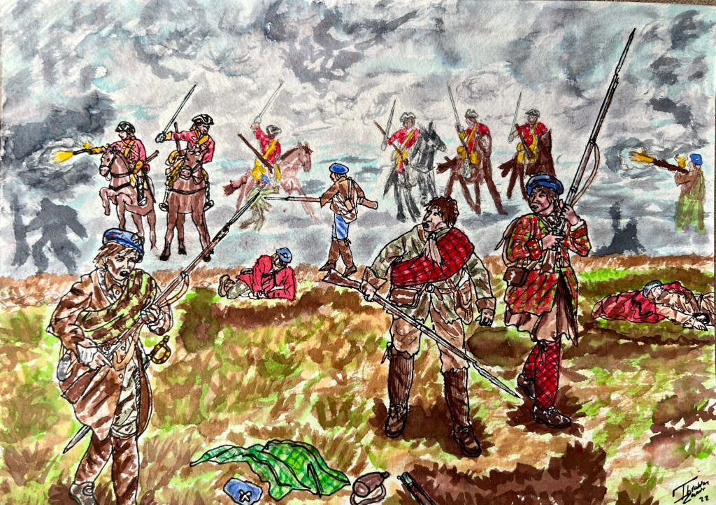 This picture depicts a scene from towards the end of the battle, as the Jacobite force entered a stage of collapse and rout. With the main engagement on the moor won by Cumberland’s infantry, three squadrons of Kerr’s 11th Dragoons were ordered to move across a re-entrant in front of them. On a crest above the re-entrant, the Jacobite rearguard – consisting of non-clan ‘Lowland’ regiments recruited north of Edinburgh – were subsequently pushed back by the dragoons, who reported 3 dead, 3 wounded, and no less than 19 horses lost.