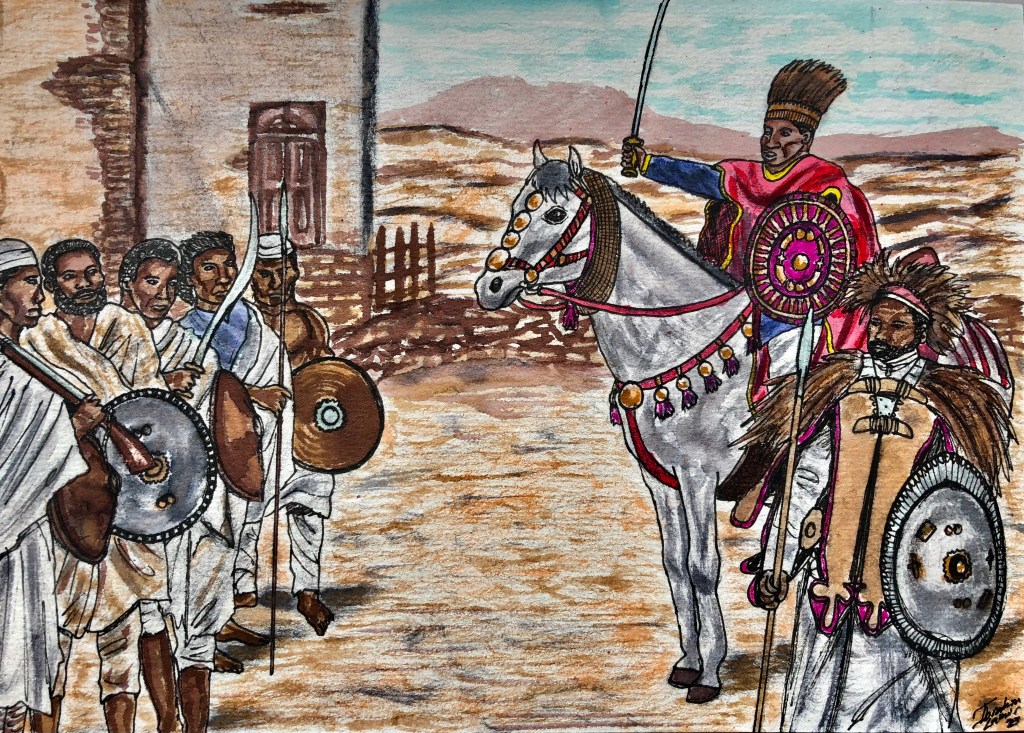 One of Menelik’s key advantages was his fragile coalition of feudal aristocrats and regional leaders united against a common enemy. A highly centralised taxation system brought in more goods to the central government than any emperor in recent memory, allowing Menelik to maintain a large standing army and support a nationwide call to arms, or kitet. In the above picture, a local chief on horseback gathers an assembled group of warriors in support of the emperor’s campaign. His fine silk robe, lion’s-mane headdress, decorated shield and horse harness are all indicative of high status. To the right is a wealthy officer wearing lion-skin and a lemd cape with two wide hanging leather extensions. The assembled warriors lack uniforms, and wear either the everyday shamma robe or shirt-tunics with trousers. Although many Ethiopians went into battle with traditional equipment, including the curved shotel sword, spear and conical hide shield, a variety of antique and modern firearms were also used.
