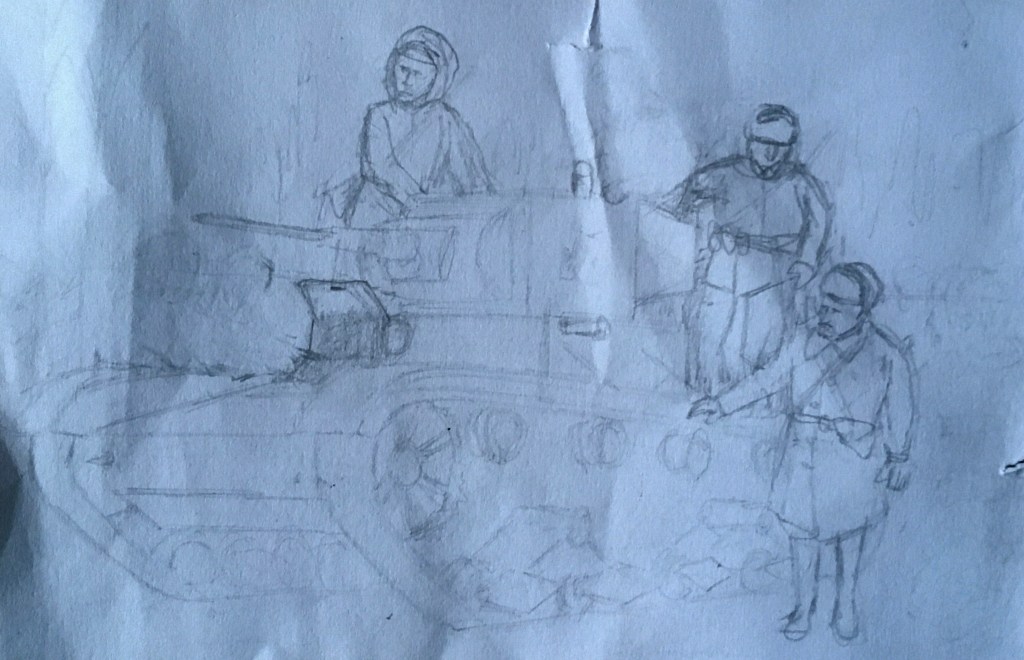 The final (and most difficult) stage involves painting from one corner and then encompassing the entire page. As time has gone by, I have grown somewhat more adept with watercolour paints and am able to blend colours to achieve certain effects, e.g. weathering on vehicles, creases on clothes. Certain areas of the tank were left plain to create the impression of thick snow. Skin tones are still an area that requires improvement; note that the figure standing to the right has an unintentionally brighter complexion than the three figures standing on the tank. Once the main focus of the picture had been painted (the soldiers and tank), I move on to the background, dabbling with black, white, and blue tones to depict a wintery environment.