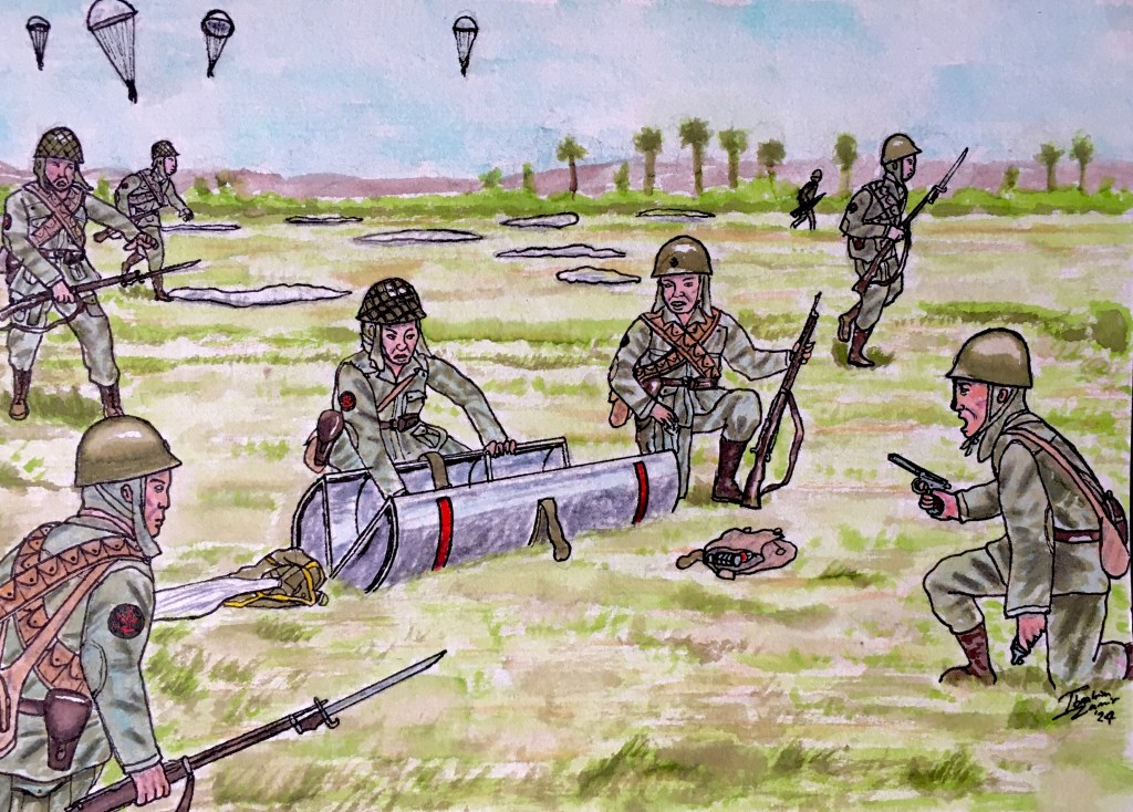 334 men of the Yokosuka 1st Special Naval Landing Force were transported by Type 96 ‘Tina’ transports 380 miles south from Davao (Philippines), completing the drop over the airfield at 1020 hrs. In this picture, a group of paratroops rush to retrieve heavy weapons from a nearby container, while in the background others advance through discarded canopies across the airfield. The paratroops are dressed in olive green jump suits, and are armed with Type 14 pistols, grenades, and 6.5 mm Type 38 carbines with bayonets and crossed bandoliers.