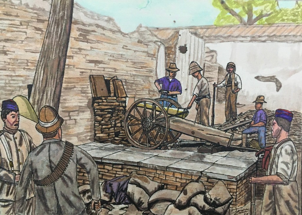 This picture, partly based on a black-and-white photograph, depicts the makeshift cannon used by the Legation defenders – a ragtag force of marines, sailors, and civilian volunteers.