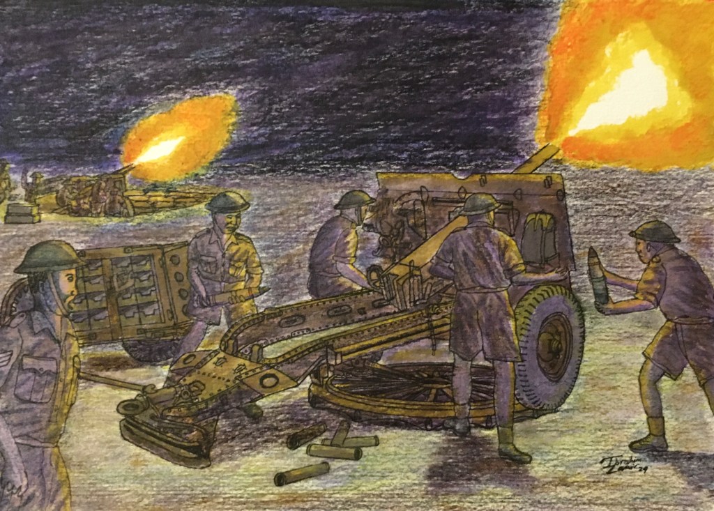 The field guns initially targeted known enemy gun locations and forward defences. Under their cover, Allied infantry began to advance through pathways in the minefields, taking most of their objectives by dawn.