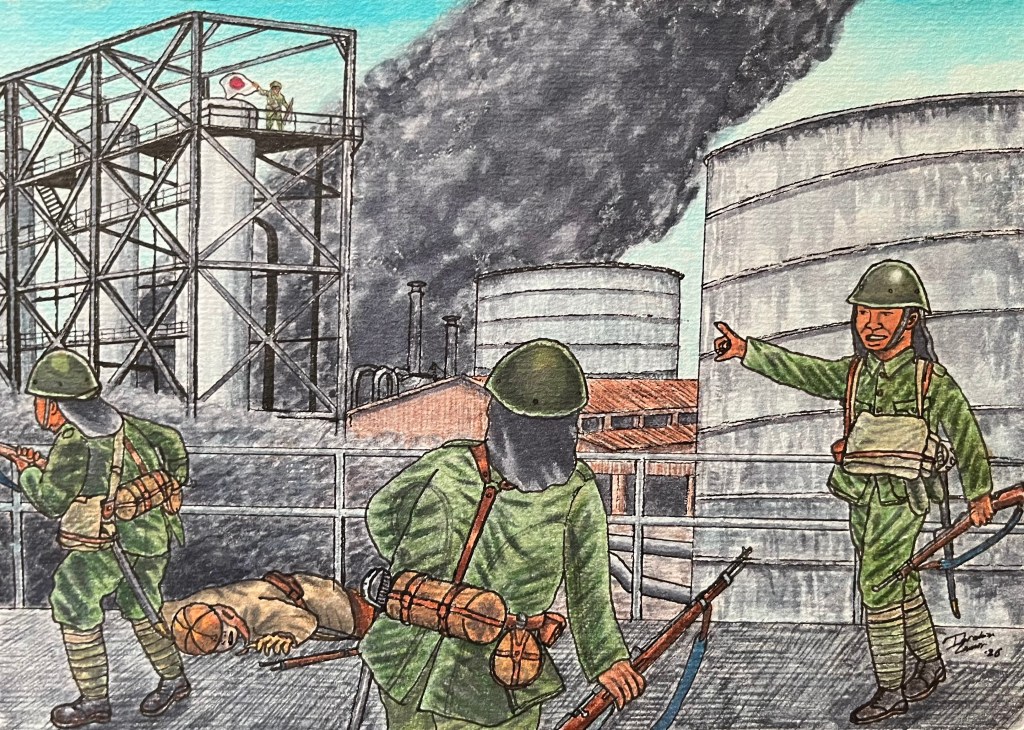 At 11.26hrs, IJA paratroopers of the 2nd Raiding Regiment dropped over P1, then over the refineries four minutes later. At Plaju, 60 men from Lieutenant Nakao’s 1st Company landed mainly to the southwest, while some landed in the oil facility itself. As the paratroopers re-grouped and advanced, they placed flags on three distillation towers and started shutting down refinery equipment to prevent damage.